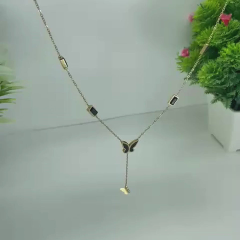 Grace meets sophistication with our Elegant Noir Butterfly Necklace. This stunning piece features a sleek gold chain adorned with glossy black accents and a delicately designed butterfly pendant, symbolizing transformation and freedom. The drop detail adds a touch of charm, making it perfect for both casual elegance and evening glamour. Crafted to be anti-tarnish, it stays radiant wear after wear — a must-have for your timeless jewellery collection.