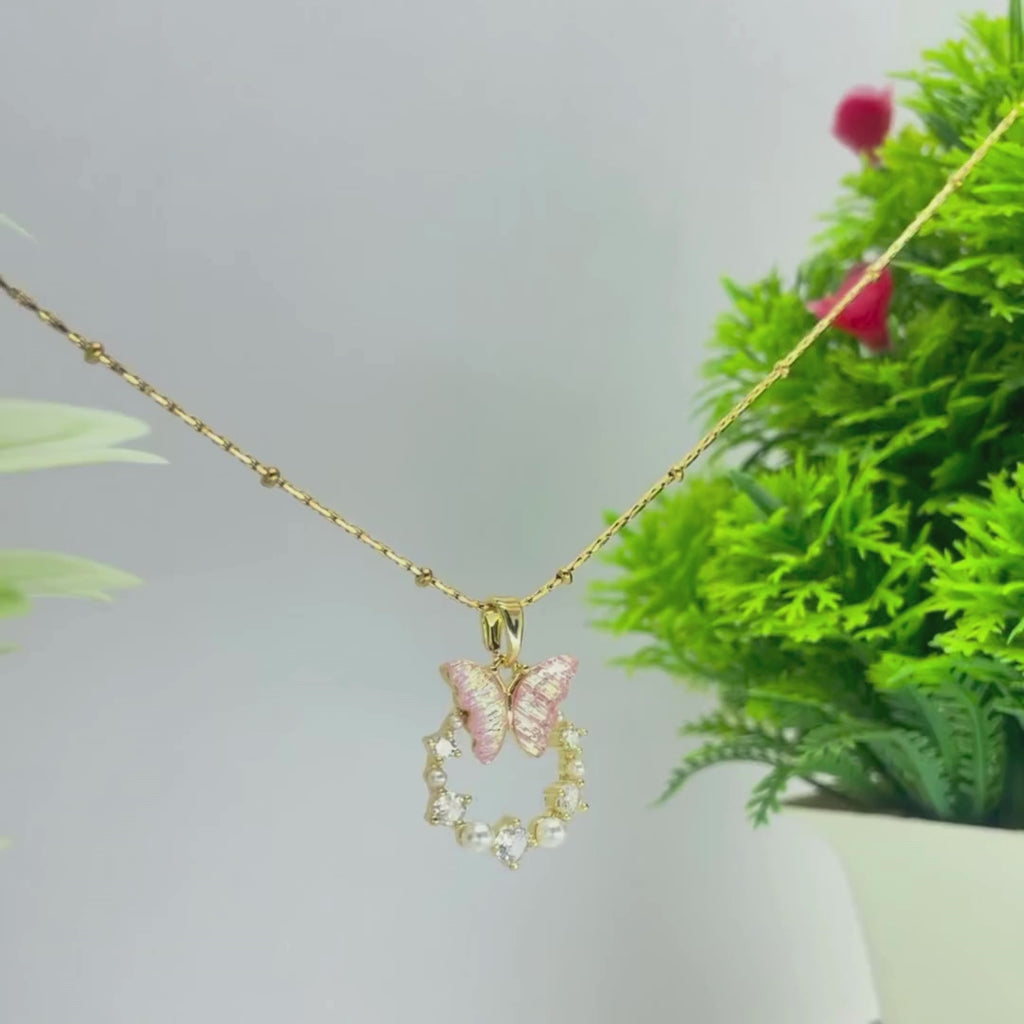 This charming pink butterfly pendant necklace combines delicate pearlescent butterfly wings with sparkling crystals and pearls. Set on a gold-plated chain, the pendant features a beautiful circular design, creating a timeless, elegant look. Perfect for adding a soft, feminine touch to any outfit, this necklace is an ideal gift for nature lovers and those who appreciate intricate, high-quality jewelry.