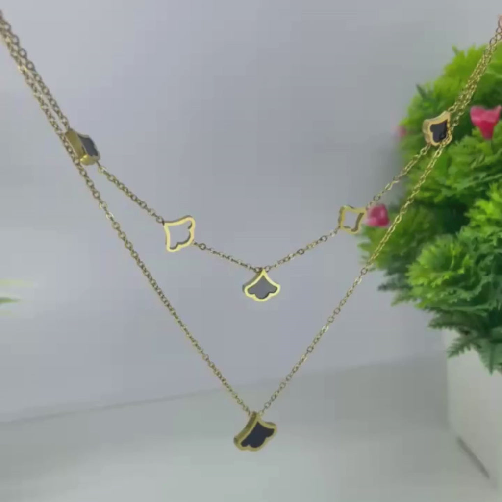 Embrace elegance with our Midnight Clover Layered Necklace, a stunning blend of modern charm and timeless grace. Featuring dual gold-toned chains adorned with black and gold clover motifs, this necklace adds depth and sophistication to any look. Perfect for both casual and evening wear, it’s designed to stay radiant and resist tarnish—making it a lasting favourite in your jewellery collection.
